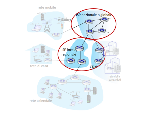 - Nucleo di rete (core o backbone): ossia un sistema di router interconnessi tra di loro, corrispondente all’insieme di nodi tramite cui viene realizzata la vera interconnessione tra tutte le reti. In particolare, all’interno del backbone di Internet sono presenti più livelli di reti ISP (es: regionali, nazionali, aziendali, …), le quali devono essere interconnesse tra di loro tramite degli Internet Exchange Point (IXP). Inoltre, nel recente periodo, nel backbone di Internet sono state integrate anche delle grandi reti private aziendali, ossia le reti dei content provider (es: Google, Netflix, …), le quali, ormai, funzionano come vere e proprie ISP.