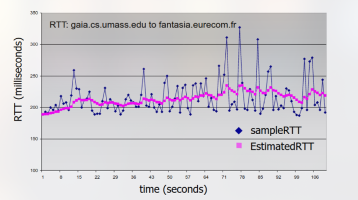 Per stimare il RTT, viene campionato un valore SampleRTT, ossia il tempo misurato dalla trasmissione del segmento fino alla ricezione dell’ACK (ignorando le ritrasmissioni). Poiché SampleRTT varia, viene utilizzata una media delle misurazioni recenti e non solo dell’ultimo SampleRTT (EWMA - Exponential Weighted Moving Average):