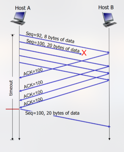 Un’ottimizzazione ulteriore del protocollo TCP prevede l’implementazione del fast retransmit: se il mittente riceve 3 ACK aggiuntivi per gli stessi dati (dunque tre ACK duplicati), viene nuovamente inviato il segmento non confermato con numero di sequenza più piccolo poiché probabilmente tale segmento è andato perso, dunque non è necessario aspettare il timeout