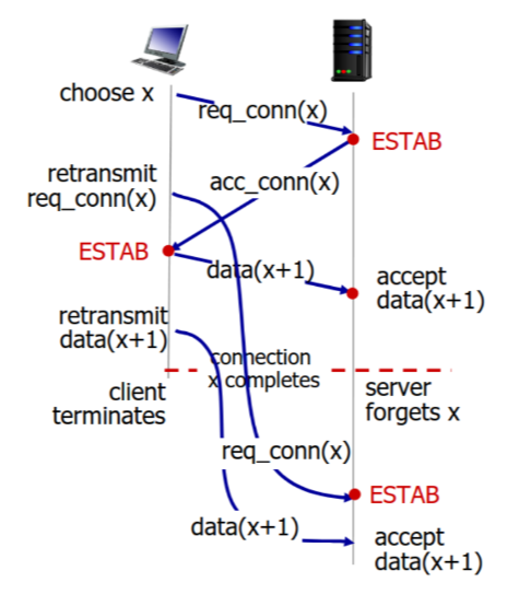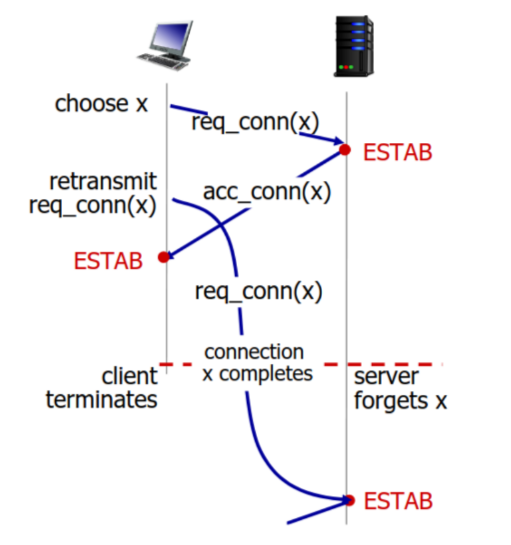 - Nel caso in cui il mittente rinvii la richiesta di connessione allo scadere del timer TCP e l’accettazione del destinatario inerente alla prima richiesta giunge comunque dopo lo scadere del timer, il mittente suppone che la connessione sia andata a buon fine (nonostante il RTT sia estremamente basso), stabilendo quindi una prima connessione.