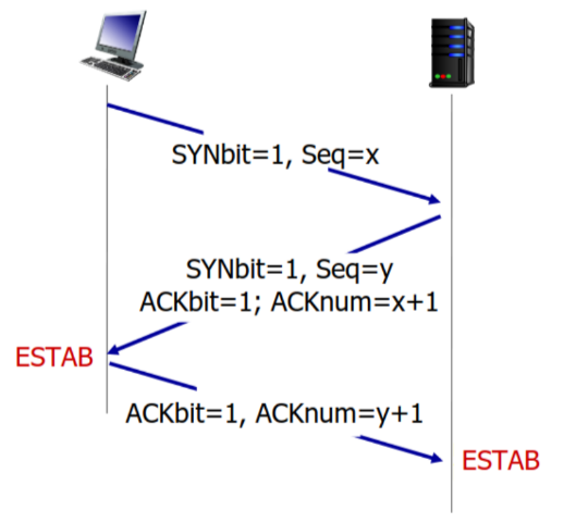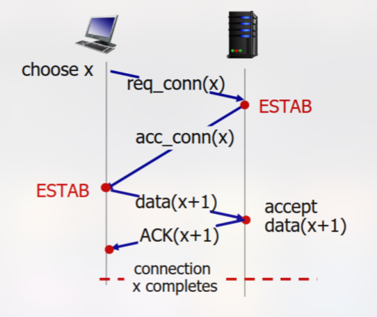 Una prima implementazione dell’handshake è l’handshake a 2 vie (two-way handshake), dove il mittente invia la richiesta di connessione al destinatario, il quale invia successivamente l’accettazione di tale richiesta, assumendo lo stato di connessione ESTAB (established).
